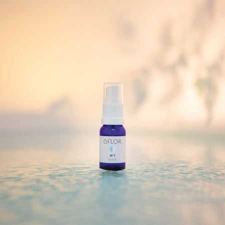 Composé d'hydrolats bi-distillés de ravintsara, mandarine, camomille, valériane dans un flacon en verre bleu.