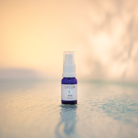 Composé d'hydrolats bi-distillés de camomille, petit-gran bigarade, néroli dans un flacon en verre bleu.