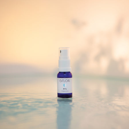 Composé d'hydrolats bi-distillés de camomille, menthe, giroflier, santal, cyprès dans un flacon en verre bleu.